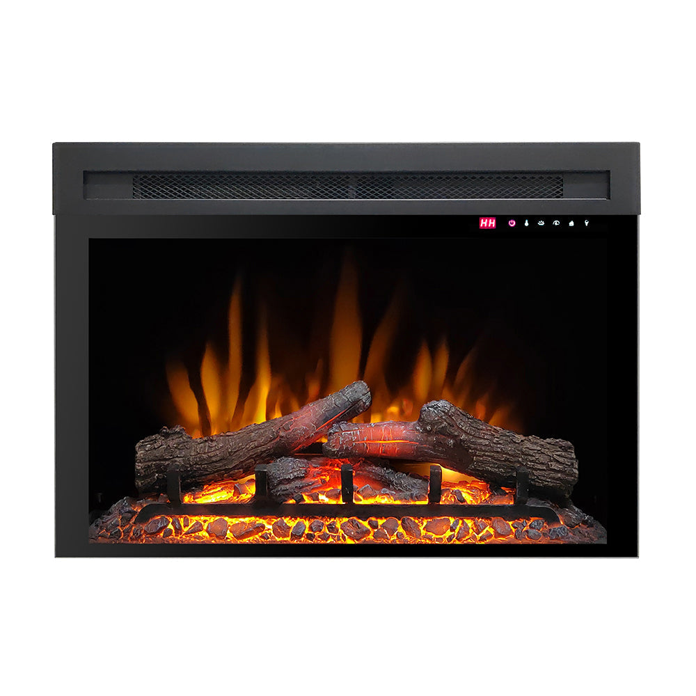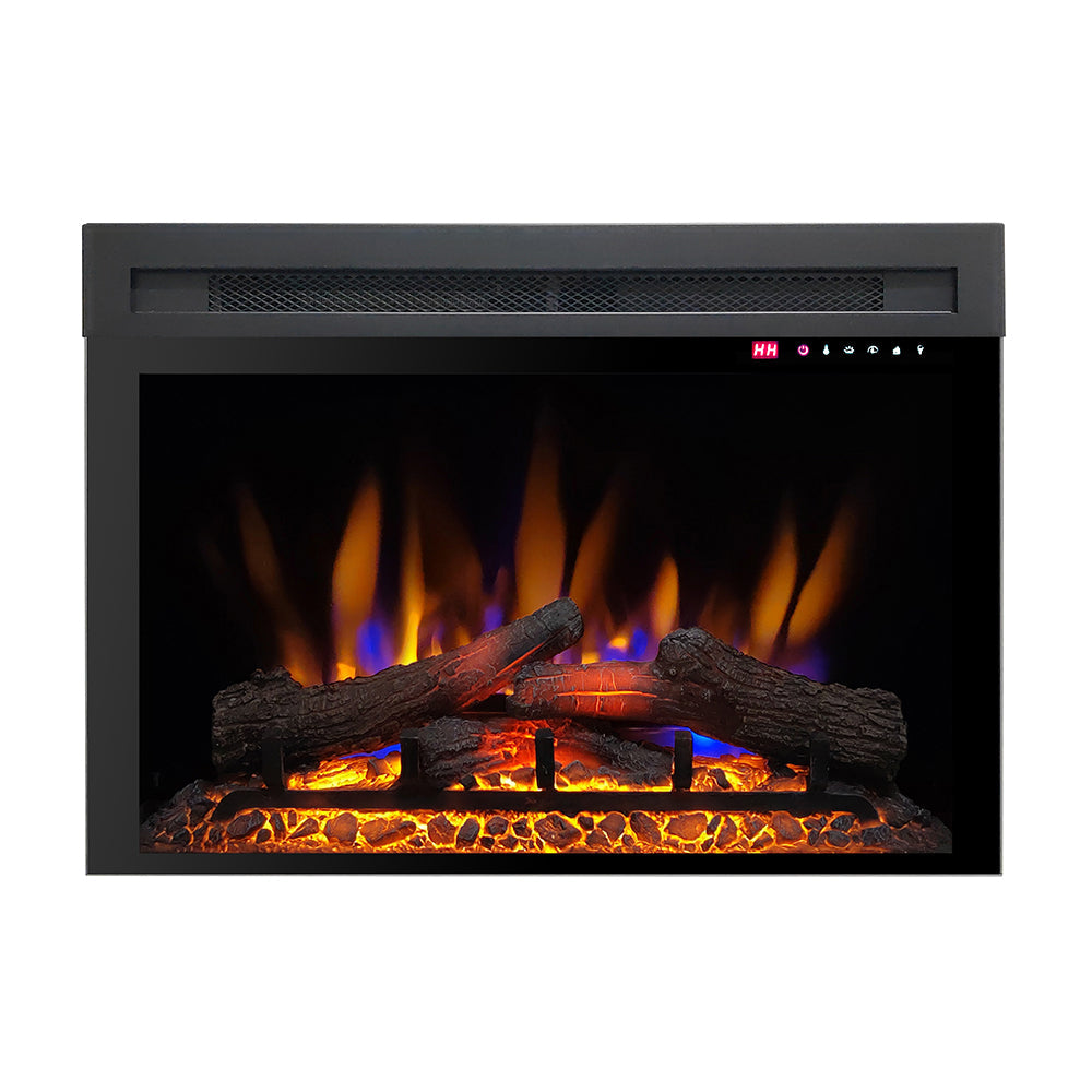 De EVIQ Amber is een moderne elektrische inzethaard die gebruikmaakt van het realistische vuureffect. Dankzij het strakke, frameloze glaspaneel en het stijlvolle ontwerp past deze haard perfect in zowel klassieke als moderne interieurs. De vlammen kunt u naar wens sneller of langzamer laten bewegen en de digitale thermostaat maakt het eenvoudig om een aangename temperatuur in te stellen. Het unieke gloeibed kan zelfs rood of blauw oplichten, zo stemt u de sfeer perfect af op uw ruimte.